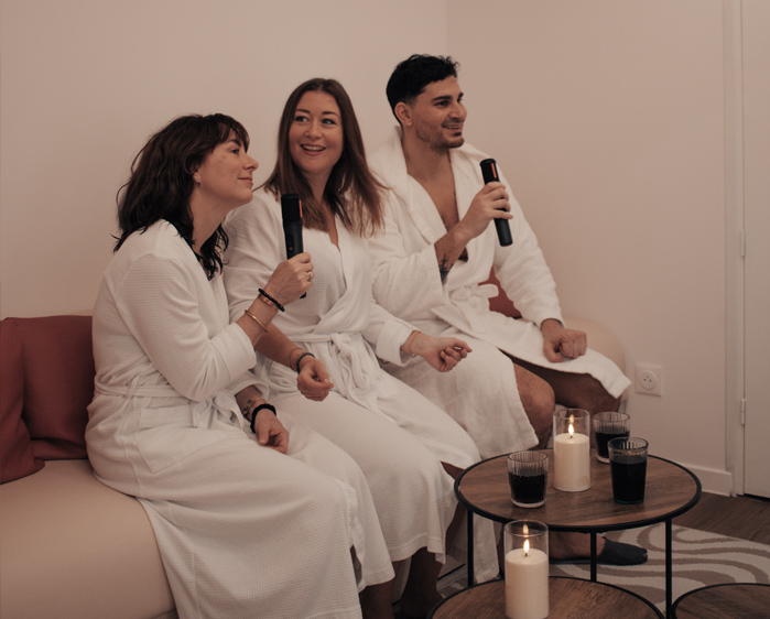 Vous réservez l'espace entier 55 m² répartis sur deux pièces communicantes pour votre groupe exclusivement. Aucune contrainte d'horaire imposée : juste vous, dans un cocon chaleureux équipé d'un jacuzzi privatif, d'un sauna infrarouge et d'un espace karaoké unique à Paris.